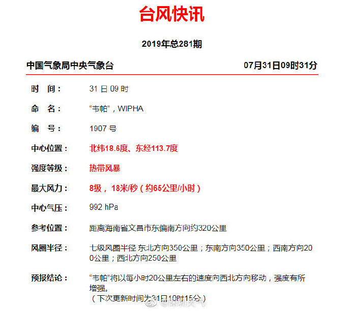 截至7月31日22時(shí),臺(tái)風(fēng)“韋帕”(熱帶風(fēng)暴級)中心位于廣東省徐聞市東偏南方向約220公里的南海西北部海面上,中心附近最大風(fēng)力9級,達(dá)到每秒23米的風(fēng)速,六級大風(fēng)半徑范圍約480公里。