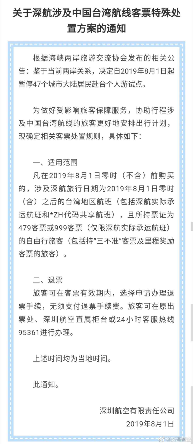深圳航空剛剛率先發(fā)布了關(guān)于深航涉及中國臺灣航線客票特殊處置方案的通知,凡在2019年8月1日零時(不含)前購買的,涉及深航旅行日期為2019年8月1日零時(含)之后的臺灣地區(qū)航班(包括深航實際承運航班和*ZH代碼共享航班),且所持票證為479客票或999客票(僅限深航實際承運航班)的自由行旅客(包括持“三不準”客票及里程獎勵客票的旅客),旅客可在客票有效期內(nèi),選擇申請辦理退票手續(xù),無須支付退票手續(xù)費。旅客可在原出票處、深圳航空直屬柜臺或24小時客服熱線95361進行辦理。