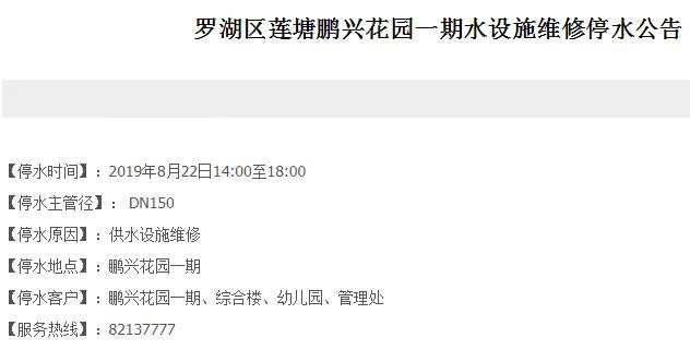 見圳客戶端·深圳新聞網(wǎng)2019年8月22日訊  據(jù)深圳水務(wù)集團(tuán)官網(wǎng)消息,8月22日這些片區(qū)計(jì)劃停水。其中,羅湖區(qū)蓮塘鵬興花園一期因供水設(shè)施維修,停水時(shí)間為下午2:00-6:00;其他片區(qū)停水時(shí)間為夜間。請受影響的市民提前做好準(zhǔn)備。