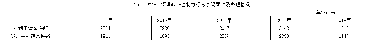 2014-2018年深圳政府法制辦行政復議案件及辦理情況