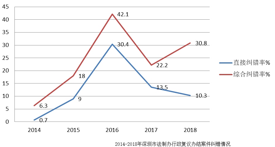 2018年深圳行政復議案件數(shù)量大幅減少,這可能與“兩隨機一公開”執(zhí)法全面推廣后執(zhí)法規(guī)范性進一步提高和執(zhí)法爭議減少有關(guān)。辦結(jié)的行政復議案件中,被撤銷或確認違法的案件比例繼續(xù)降低,但裁定終止的案件總件數(shù)雖略少于上年,比例卻有一定幅度上升。總體而言,行政復議的直接糾錯率有所下降,但間接糾錯率有所上升,較好發(fā)揮了行政復議對行政執(zhí)法的監(jiān)督作用。