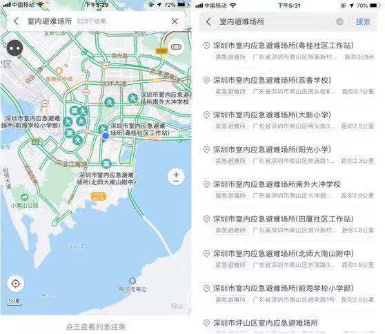 目前,深圳市已建成的592處室內(nèi)應(yīng)急避難場所位置信息已經(jīng)標(biāo)注在騰訊地圖上。深圳市民可在騰訊地圖APP端,或在“騰訊地圖+”微信小程序中,搜索“室內(nèi)應(yīng)急避難場所”,獲取附近所有室內(nèi)應(yīng)急避難場所的地理位置、名稱、地址、緊急聯(lián)系電話等信息,同時(shí)可一鍵導(dǎo)航,盡快抵達(dá)。