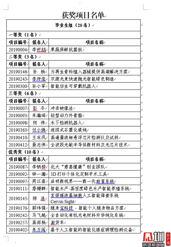 據(jù)了解,2019深圳“逐夢(mèng)杯”大學(xué)生創(chuàng)新創(chuàng)業(yè)大賽由市人力資源保障局、市教育局、團(tuán)市委共同主辦,深圳大學(xué)等15所高校協(xié)辦,市公共就業(yè)服務(wù)中心承辦。大賽自2016年開始,每年舉辦一屆,今年是第四屆。本屆大賽延續(xù)“逐夢(mèng)青春創(chuàng)贏未來(lái)”的主題,也是首次將港澳籍青年創(chuàng)業(yè)者納入?yún)①惙秶4筚愑诮衲?月正式啟動(dòng),共有397個(gè)項(xiàng)目報(bào)名參賽,參賽項(xiàng)目歷經(jīng)資格初審、初賽、復(fù)賽、決賽,最終30個(gè)優(yōu)秀創(chuàng)業(yè)項(xiàng)目脫穎而出,贏得大獎(jiǎng)。其中,“果蔬保鮮抗菌肽”項(xiàng)目獲畢業(yè)組一等獎(jiǎng),“智能仿生可穿戴機(jī)器人”等3個(gè)項(xiàng)目獲畢業(yè)組二等獎(jiǎng),“沖擊映像法”等6個(gè)項(xiàng)目獲畢業(yè)組三等獎(jiǎng),“北大‘意嘉健康’創(chuàng)業(yè)團(tuán)隊(duì)”等10個(gè)項(xiàng)目獲畢業(yè)組優(yōu)秀獎(jiǎng);“智能支架”項(xiàng)目獲在校生組一等獎(jiǎng),“Uservo伺服驅(qū)動(dòng)器”等3個(gè)項(xiàng)目獲在校生組二等獎(jiǎng),“易碼人青少年編程”等6個(gè)項(xiàng)目獲在校生組三等獎(jiǎng)。
