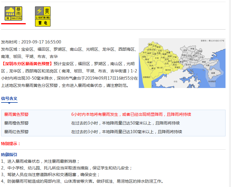 市氣象局預(yù)計(jì)寶安區(qū),福田區(qū),羅湖區(qū),南山區(qū),光明區(qū),龍華區(qū),西部海區(qū)和龍崗區(qū)(南灣、坂田、平湖、布吉、吉華街道)1-2小時(shí)內(nèi)將出現(xiàn)30-50毫米降水,深圳市氣象臺(tái)于2019年09月17日16時(shí)55分在上述地區(qū)發(fā)布暴雨黃色分區(qū)預(yù)警,全市進(jìn)入暴雨戒備狀態(tài),請(qǐng)注意防范。