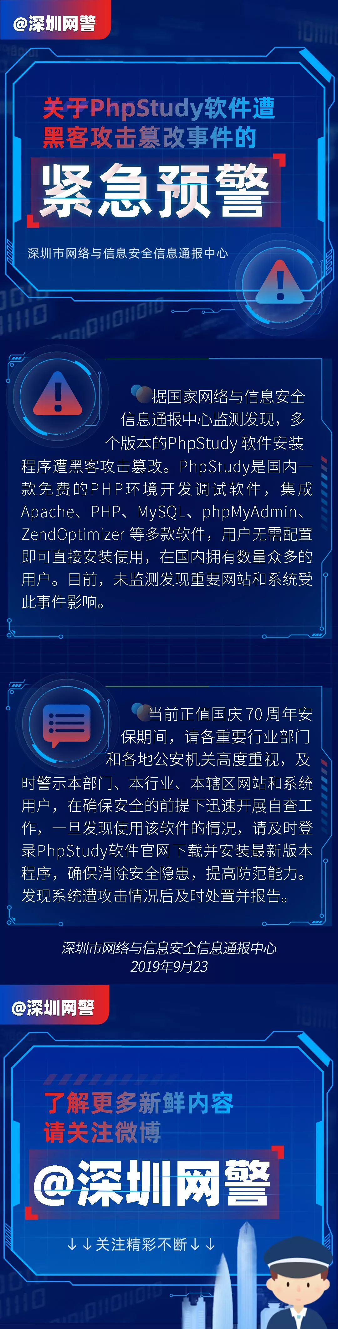 見圳客戶端·深圳新聞網(wǎng)2019年9月25日訊 據(jù)國家網(wǎng)絡與信息安全信息通報中心監(jiān)測發(fā)現(xiàn),多個版本的PhpStudy軟件安裝程序遭黑客攻擊篡改。目前,未監(jiān)測發(fā)現(xiàn)重要網(wǎng)站和系統(tǒng)受此事件影響。