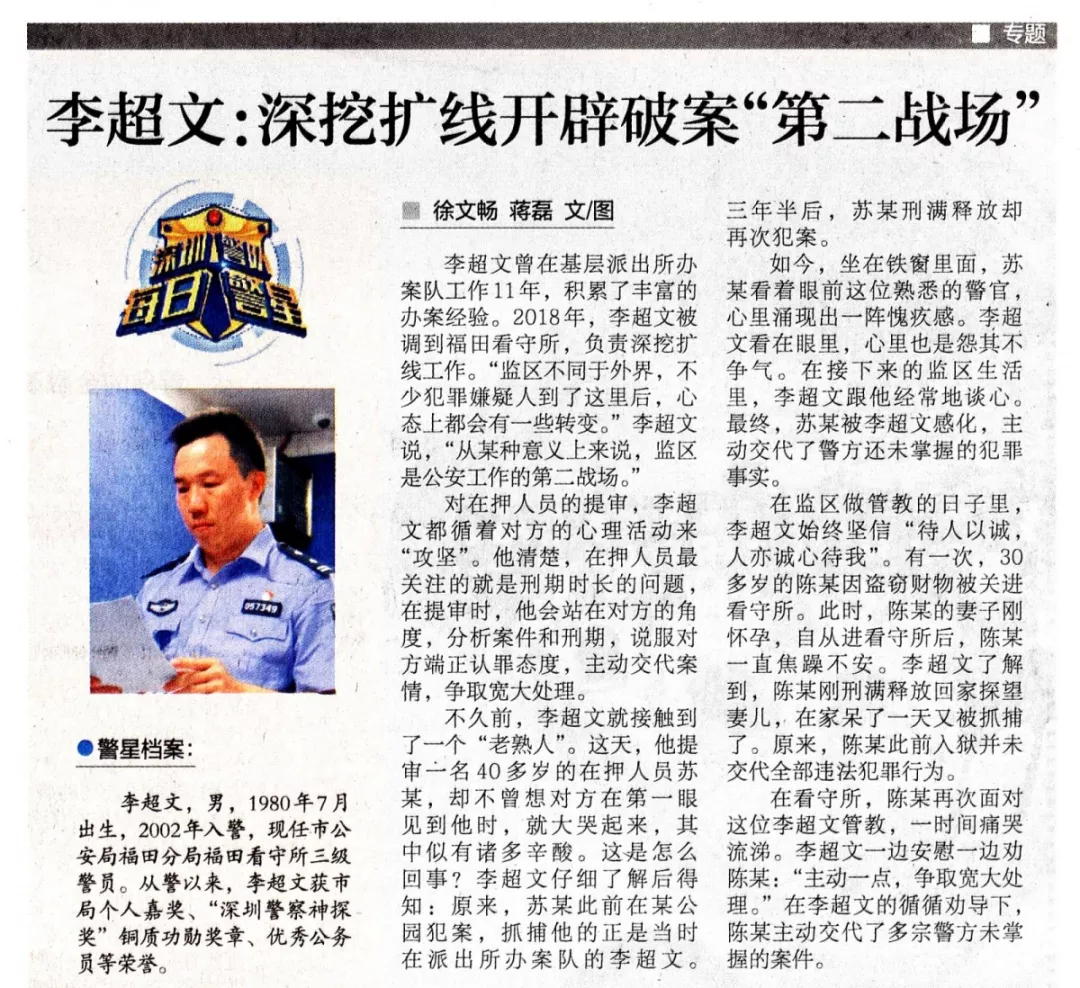 李超文曾在基層派出所辦案隊工作11年,積累了豐富的辦案經(jīng)驗。2018年,李超文被調(diào)到福田看守所,負責深挖擴線工作?!氨O(jiān)區(qū)不同于外界,不少犯罪嫌疑人到了這里后,心態(tài)上都會有一些轉(zhuǎn)變?!崩畛恼f,“從某種意義上來說,監(jiān)區(qū)是公安工作的第二戰(zhàn)場。”