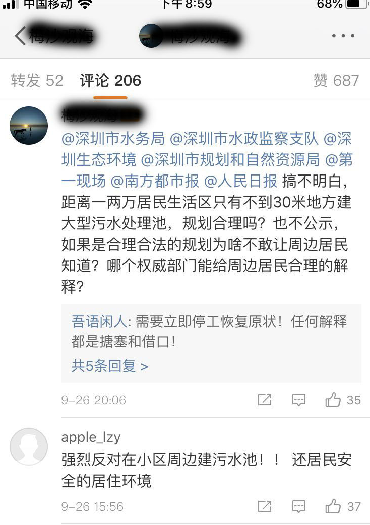 深圳特區(qū)報(bào)2019年10月11日訊 “南山寶珠花園、龍都名園附近距離小區(qū)不到30米建大型污水處理池,規(guī)劃部門怎么想的,不怕周圍居民不答應(yīng)嗎?考慮過周邊居民的健康嗎?”近日,有市民在微博發(fā)文向媒體報(bào)料。