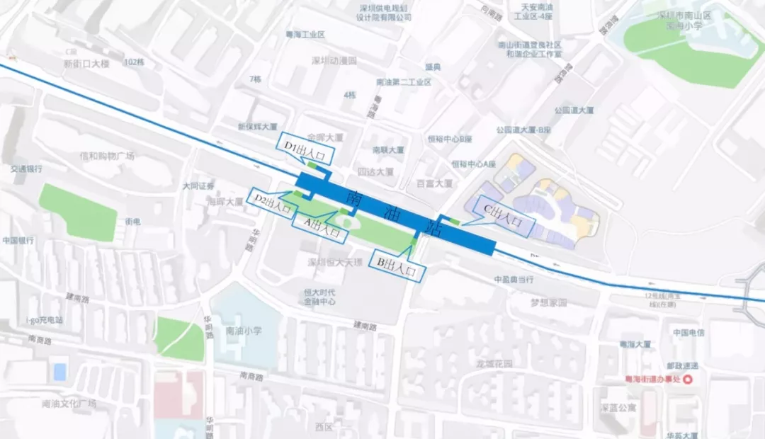 9號(hào)線二期南油站位于南山區(qū)南海大道與登良路交叉口下方,沿南海大道呈南北向敷設(shè),為地下2層車站,地下一層為站廳層,地下二層為站臺(tái)層,車站總長334m,車站出入口共計(jì)5個(gè)A出入口、B出入口、C出入口、D1出入口、D2出入口。B出入口位于恒大天璟北側(cè),C出入口位于來福士廣場(chǎng)一側(cè)登良路與南海大道交匯處,D1出入口位于金暉大廈東側(cè),A、D2出入口位于南海大道與華明路交匯處。