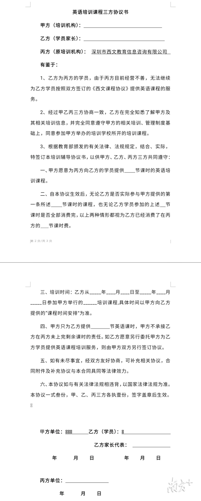 退費(fèi)群里的周女士介紹,10月20日,西文英語(yǔ)提供了一份“英語(yǔ)培訓(xùn)課程三方協(xié)議書(shū)”,但上面很多條款都沒(méi)有寫(xiě)清楚。西文英語(yǔ)委托的律師稱(chēng),山姆大叔少兒英語(yǔ)愿意給西文英語(yǔ)的學(xué)員免費(fèi)提供30節(jié)課程,但學(xué)員在西文英語(yǔ)其他剩余課時(shí)的解決方案,需自行和山姆大叔協(xié)商。