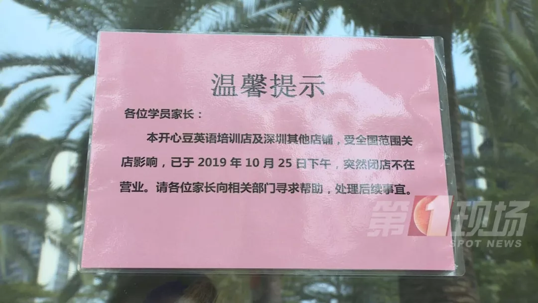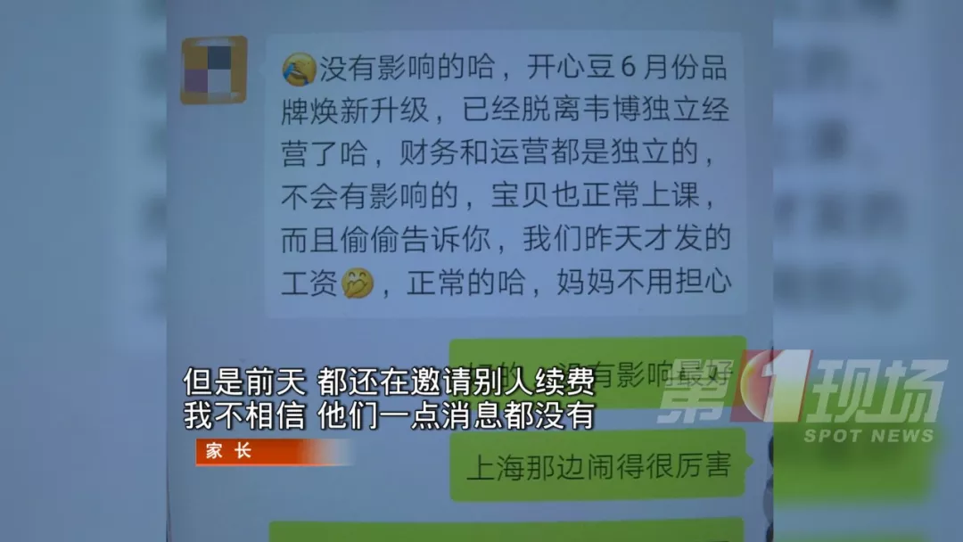 深廣電第一現(xiàn)場2019年10月27日訊 韋博英語倒閉風波席卷全國,它旗下的少兒英語品牌——開心豆少兒英語最近也被傳出經(jīng)營不善,多家門店停業(yè),不少深圳的家長向我們求助,說他們家附近的開心豆招呼都不打就關(guān)門,負責人也不見了,這是怎么回事?