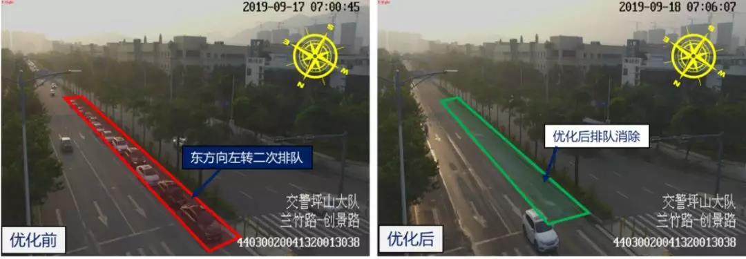 針對這一問題,深圳交警根據(jù)路口各時段、各方向的通勤需求,調(diào)整優(yōu)化了路口紅綠燈配時方案,適當增加了擁堵方向時間。優(yōu)化后,路口晚高峰西往東方向車輛排隊由300多米降至60米左右,下降80%,車輛基本實現(xiàn)1次通行。
