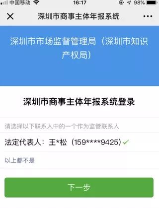 第三步:系統(tǒng)自動彈出市場監(jiān)管聯(lián)系人備選項(xiàng),選擇市場監(jiān)管聯(lián)系人后,點(diǎn)擊下一步。