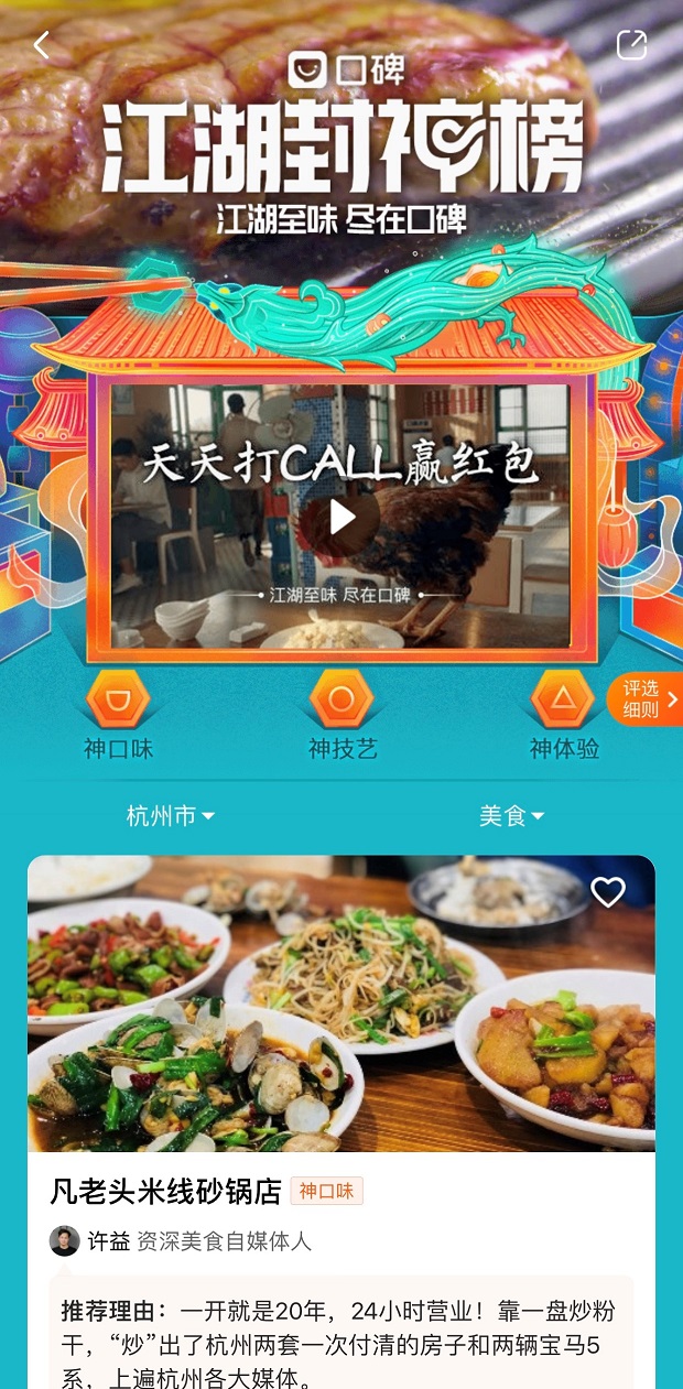 見圳客戶端·深圳新聞網2019年12月2日訊(見圳客戶端、深圳新聞網記者 余俐潔 通訊員 涂雅琴)天貓“雙11”余熱未散,12月1日,口碑餓了么聯合支付寶正式開啟“1212支付寶生活節(jié)”組隊下單瓜分億元大獎,海量紅包全年特惠,口碑吃喝玩樂全場5折起、小二美食探店直播、薅羊毛……而12月2日,口碑餓了么正式發(fā)布“江湖封神榜”,已有13城的1730家店鋪入圍,這份以全新標準排名制作的美食榜單以個人喜好和數據智能為核心維度,真正實現了用戶與商戶精準、有效、便捷的對接。深圳金戈戈、卓記米粉、天寶兄弟、高三姐豆花川菜店、嘉華小吃等86家店鋪入圍上榜。