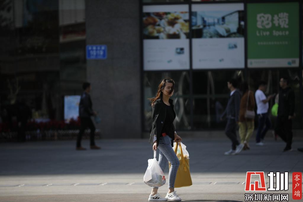 華強(qiáng)北商圈,大風(fēng)吹亂了一位出行女士的頭發(fā)。