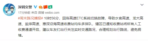 10時56分,因各高速ETC系統(tǒng)切換故障,導(dǎo)致水官高速、龍大高速、鹽排高速、惠深沿海高速收費(fèi)站均車多排隊(duì),轄區(qū)已通知收費(fèi)站將所有人工收費(fèi)通道開啟,建議車友們出行關(guān)注實(shí)時交通路況,合理規(guī)劃出行路線,避免擁堵。
