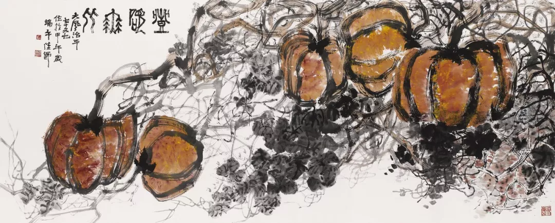 魏治平的畫,尤以藤類見長(zhǎng),構(gòu)圖奇異,筆酣墨飽,瓜果菜蔬鳥蟲魚,無一不獨(dú)出心裁,氣象崢嶸,水墨淋漓之間極富創(chuàng)作精神,他筆下的南瓜、紫藤、凌霄、葡萄等更有齊白石、吳昌碩之風(fēng),自成一派,奔放不離法度,神微孕育氣魄。