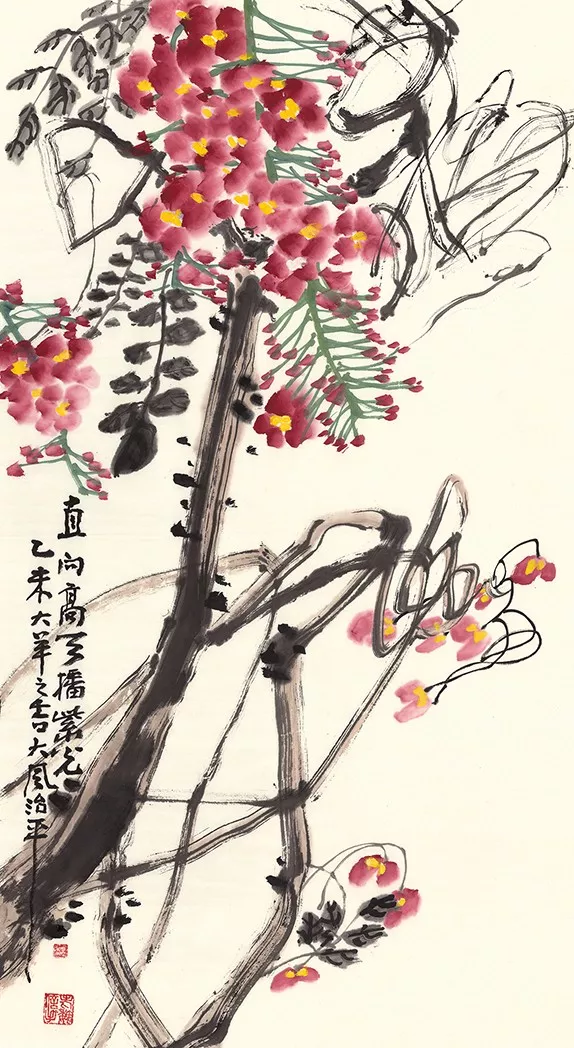 魏治平的藝術(shù)貴于創(chuàng)造,以書法入畫,畫中常見有篆書筆意。三十年前長(zhǎng)江日?qǐng)?bào)總編海洋先生,曾提筆寫下《魏瘋子傳奇》,洋洋灑灑八千言,一時(shí)間荊楚大地震動(dòng)。西泠印社理事朱妙根稱其“方寸之間有靈山,紅花墨葉又一派”。西泠印社執(zhí)行社長(zhǎng)、中國(guó)印學(xué)博物館館長(zhǎng)劉江先生為其第一本書畫作品集題簽書名。美國(guó)前總統(tǒng)老布什收有魏老書法作品“龍蛇競(jìng)走舞長(zhǎng)空、點(diǎn)染梅花分外紅。且賦新詩(shī)遙寄意,長(zhǎng)江密水兩相通”。印第安納州州立大學(xué)博物館大廳懸掛的便是魏老八尺紅梅詩(shī)書畫中堂。