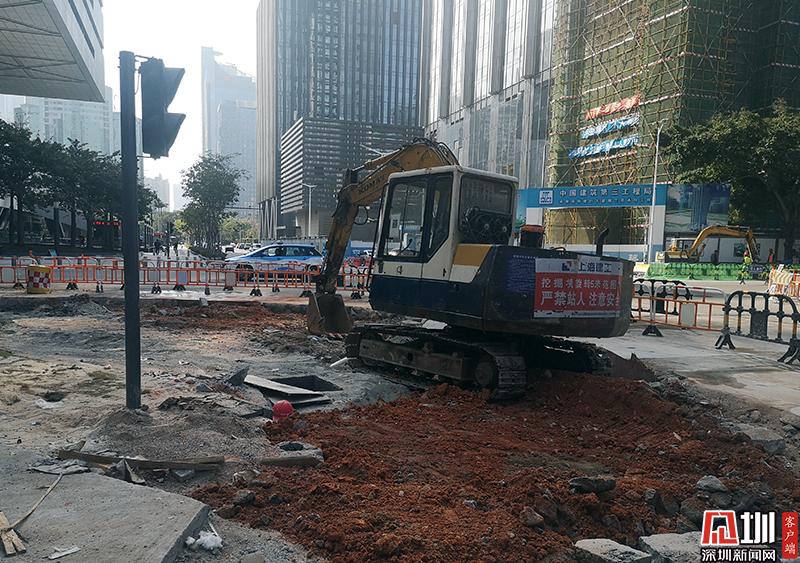 福田區(qū)福中三路和民田路的施工現(xiàn)場(chǎng),道路被挖,一輛挖掘機(jī)停在道路上。
