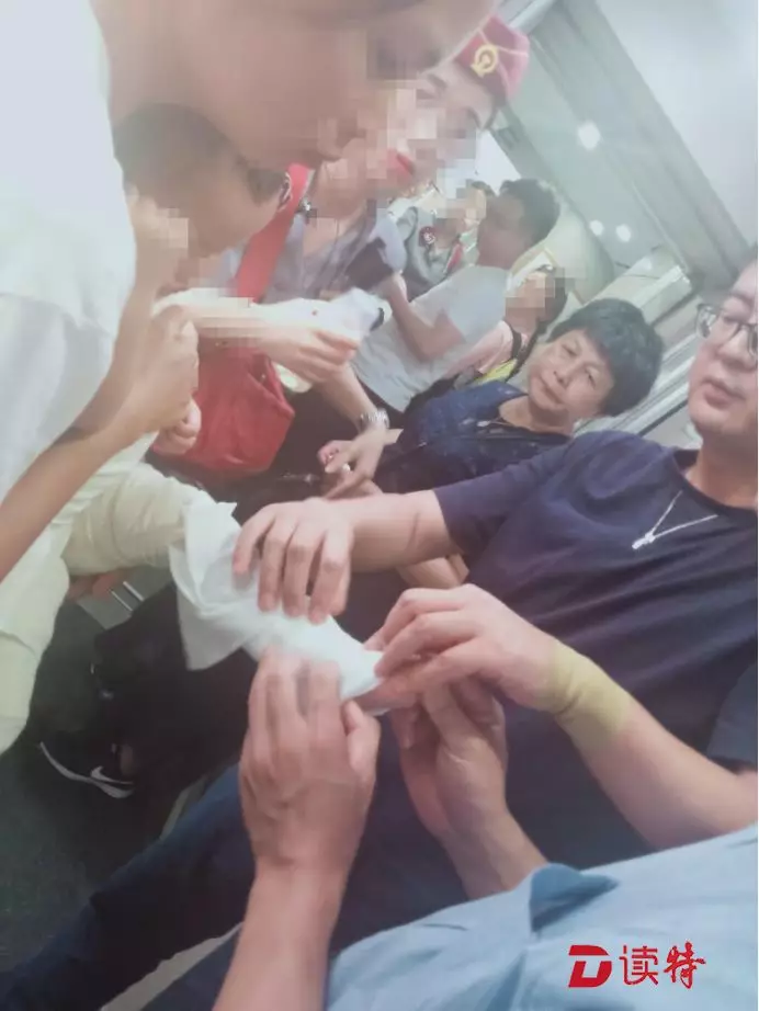 2019年7月27日晚上,一名一歲小童在高鐵上被開水燙傷,同在高鐵上的龍華區(qū)人民醫(yī)院燒傷整形科黃謙主任等一行人迅速前往3號(hào)車廂查看情況。