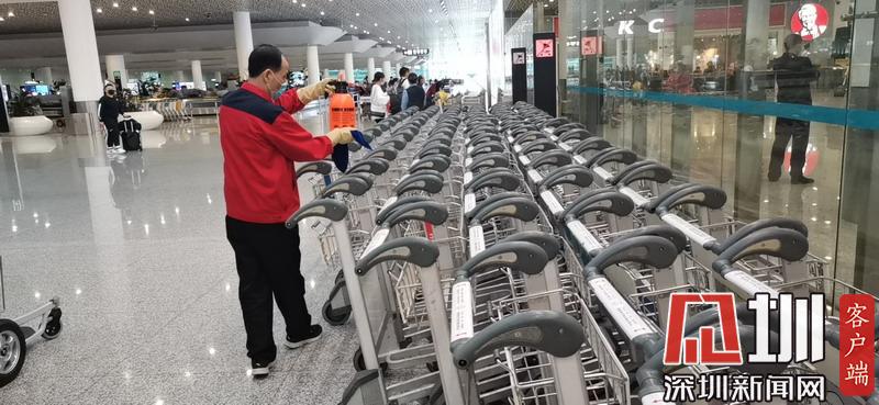 深圳機(jī)場(chǎng)工作人員對(duì)行李推車進(jìn)行消毒。