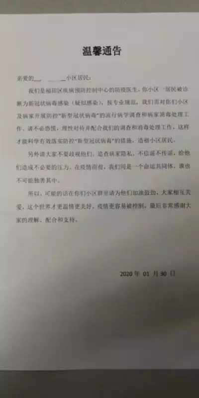 1月30日,由于深圳一小區(qū)出現(xiàn)新冠狀病毒疑似感染病例,福田區(qū)疾病預防控制中心的防疫醫(yī)生發(fā)布了這則通告。通告除了呼吁小區(qū)居民配合調查及消毒處理工作外,還特地懇請大家“不要歧視,在疫情面前,我們是同一個命運共同體,誰也不可能獨善其身?!辈恢獮楹?,雖不是湖北人也未曾受過歧視,但還是被這寥寥數(shù)字的“請求”溫暖了。