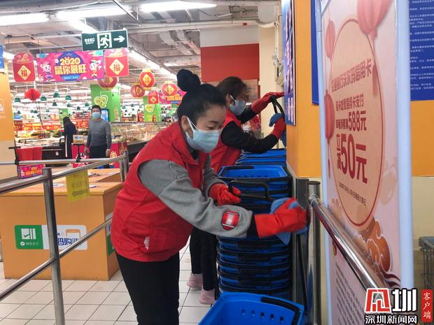 見圳客戶端·深圳新聞網(wǎng)2020年1月31日訊(見圳客戶端、深圳新聞網(wǎng)記者 胡津瑋)戴上口罩、手套,再穿上標(biāo)志性的紅色馬甲,市食藥志愿服務(wù)總隊(duì)的志愿者們紛紛走上超市的各個(gè)崗位,清理貨品、補(bǔ)貨、對(duì)購(gòu)物車購(gòu)物籃進(jìn)行清潔消毒、為來(lái)購(gòu)物的市民測(cè)量體溫…據(jù)了解,由于春節(jié)期間各大商超缺少人手,在市市場(chǎng)監(jiān)管局與團(tuán)市委的指導(dǎo)下,市食藥志愿服務(wù)總隊(duì)迅速調(diào)動(dòng)全市在深的食品藥品安全志愿者,成立了由近300名食品藥品安全志愿者組成的春節(jié)“菜籃子”志愿者保障工作小組,為全市各大商超提供志愿服務(wù),全力保障市場(chǎng)供應(yīng)、消除市民顧慮,在防控疫情特殊期間注入了紅馬甲的正能量。記者今天便走訪了深圳的一家超市,尋找這批紅色的身影,了解他們一天的工作。