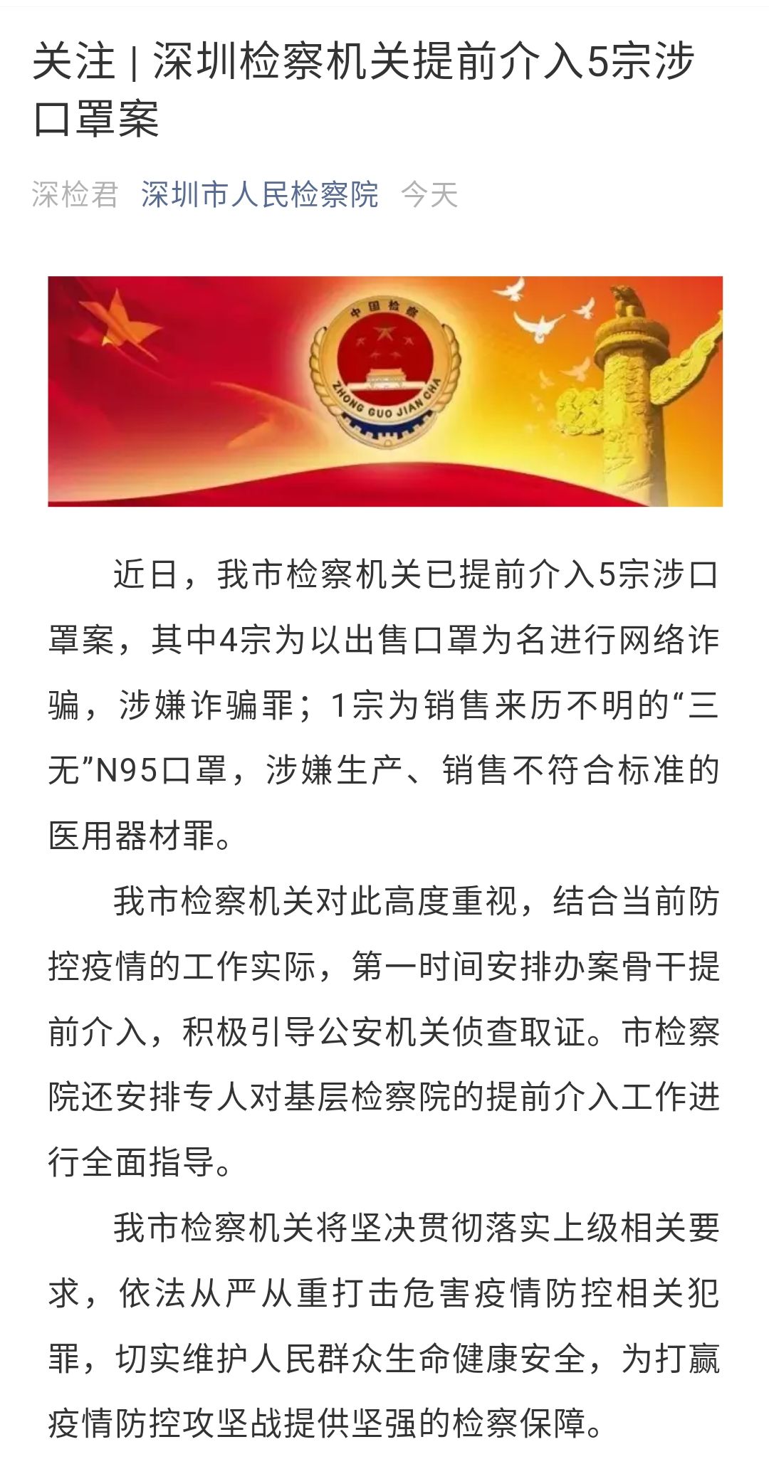 深圳市檢察機關表示,將堅決貫徹落實上級相關要求,依法從嚴從重打擊危害疫情防控相關犯罪,切實維護人民群眾生命健康安全,為打贏疫情防控攻堅戰(zhàn)提供堅強的檢察保障。