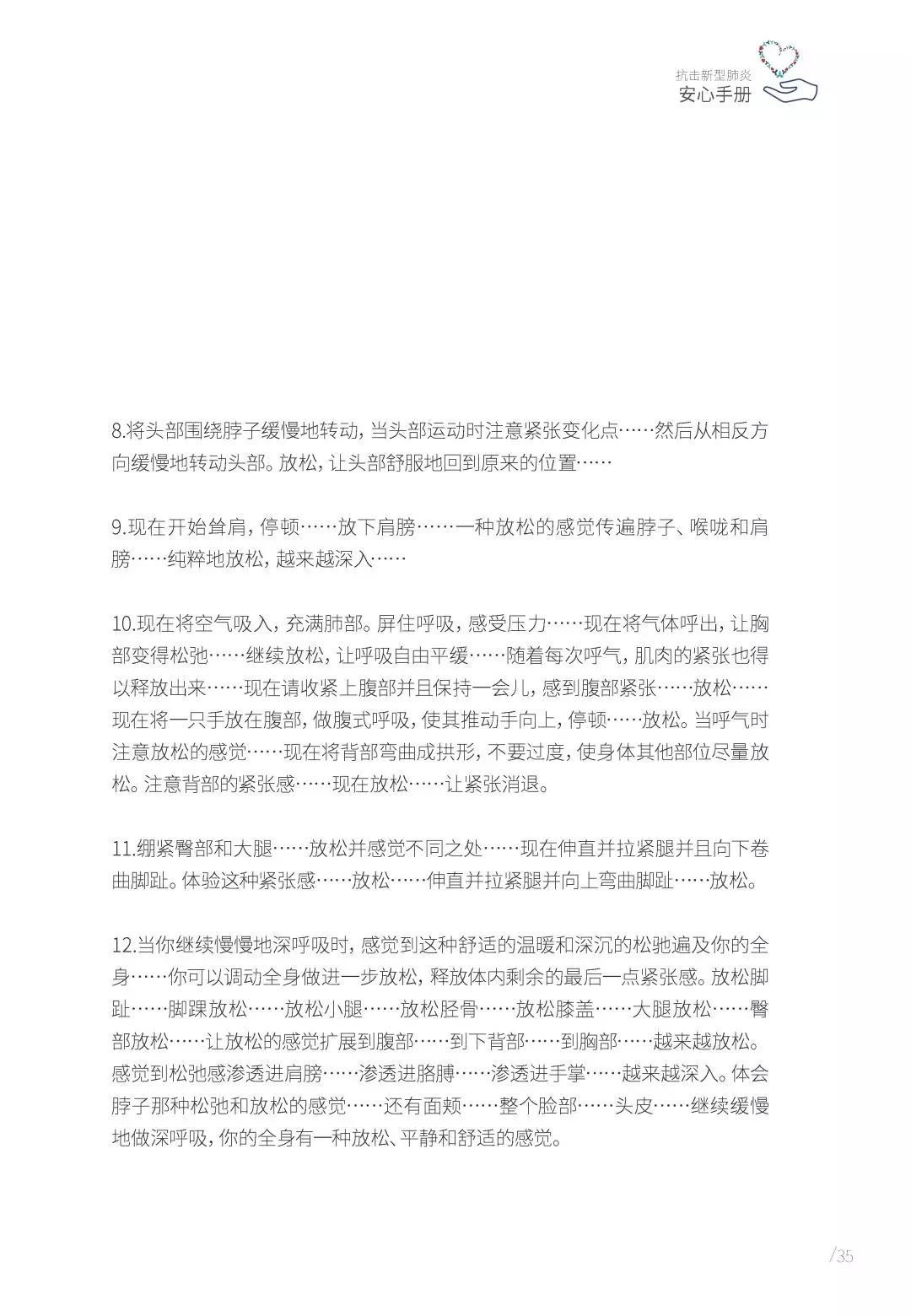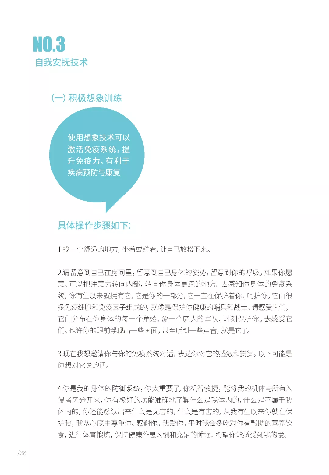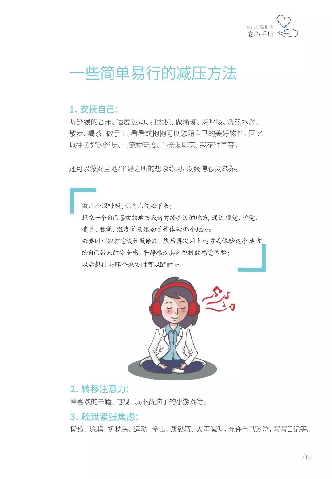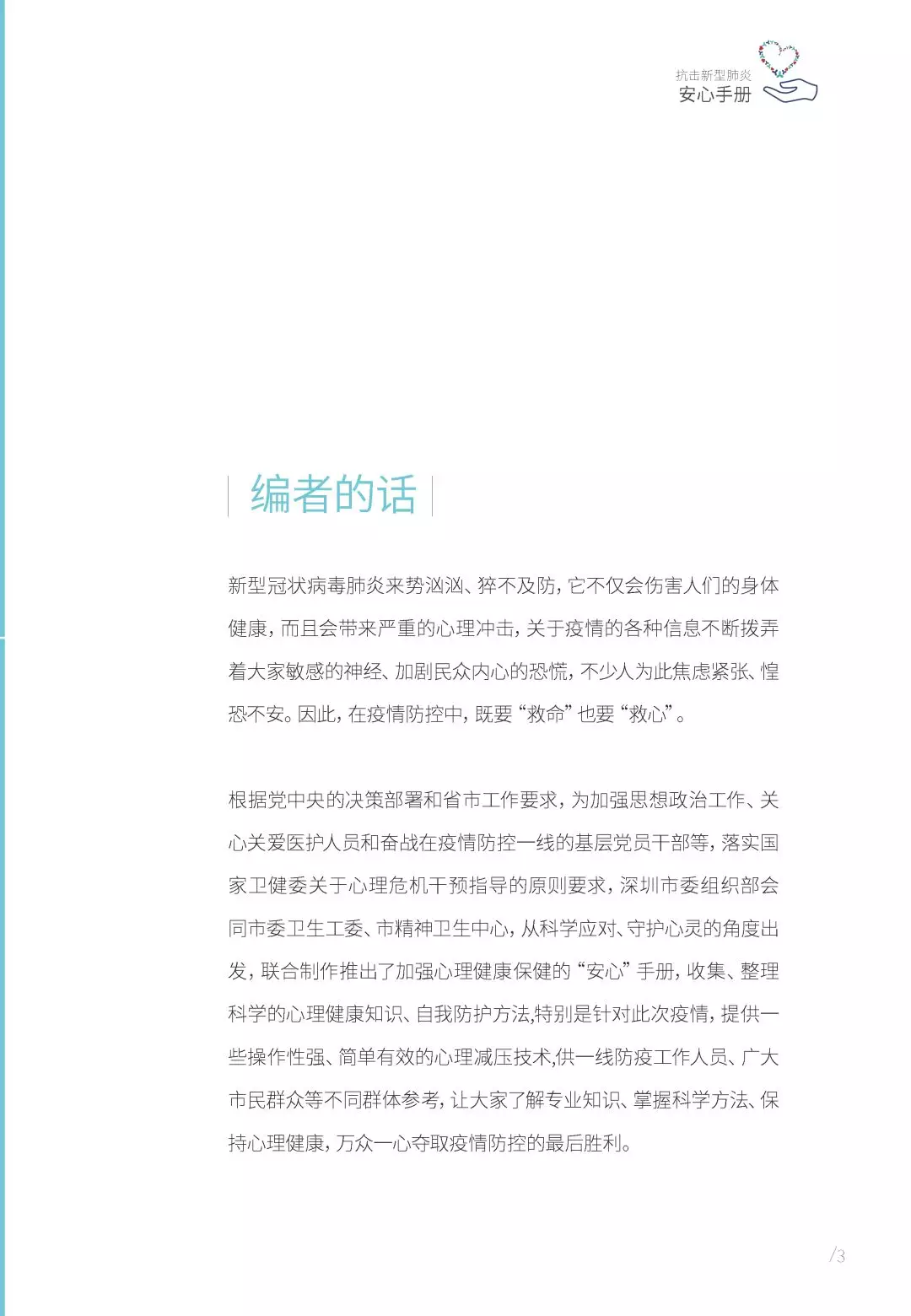 根據(jù)黨中央的決策部署和省市工作要求,為加強思想政治工作、關(guān)心關(guān)愛醫(yī)護人員和奮戰(zhàn)在疫情防控一線的基層黨員干部等,落實國家衛(wèi)健委關(guān)于心理危機干預指導的原則要求,深圳市委組織部會同市委衛(wèi)生工委、市精神衛(wèi)生中心,從科學應對、守護心靈的角度出發(fā),聯(lián)合制作推出了加強心理健康保健的“安心”手冊,收集、整理科學的心理健康知識、自我防護方法,特別是針對此次疫情,提供一些操作性強、簡單有效的心理減壓技術(shù),供一線防疫工作人員、廣大市民群眾等不同群體參考,讓大家了解專業(yè)知識、掌握科學方法、保持心理健康,萬眾一心奪取疫情防控的最后勝利。