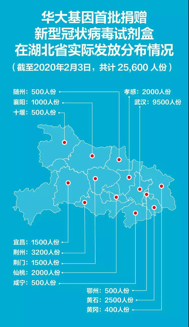 2月5日,記者獲悉,華大基因首批承諾向湖北地區(qū)捐贈(zèng)的2萬(wàn)人份新型冠狀病毒試劑盒(每盒50人份),實(shí)際已發(fā)貨到位2.56萬(wàn)人份。其中,武漢市發(fā)放9500人份,湖北(非武漢地區(qū))發(fā)放1.61萬(wàn)人份。目前,針對(duì)湖北地區(qū)的試劑盒捐贈(zèng)仍在進(jìn)行中。