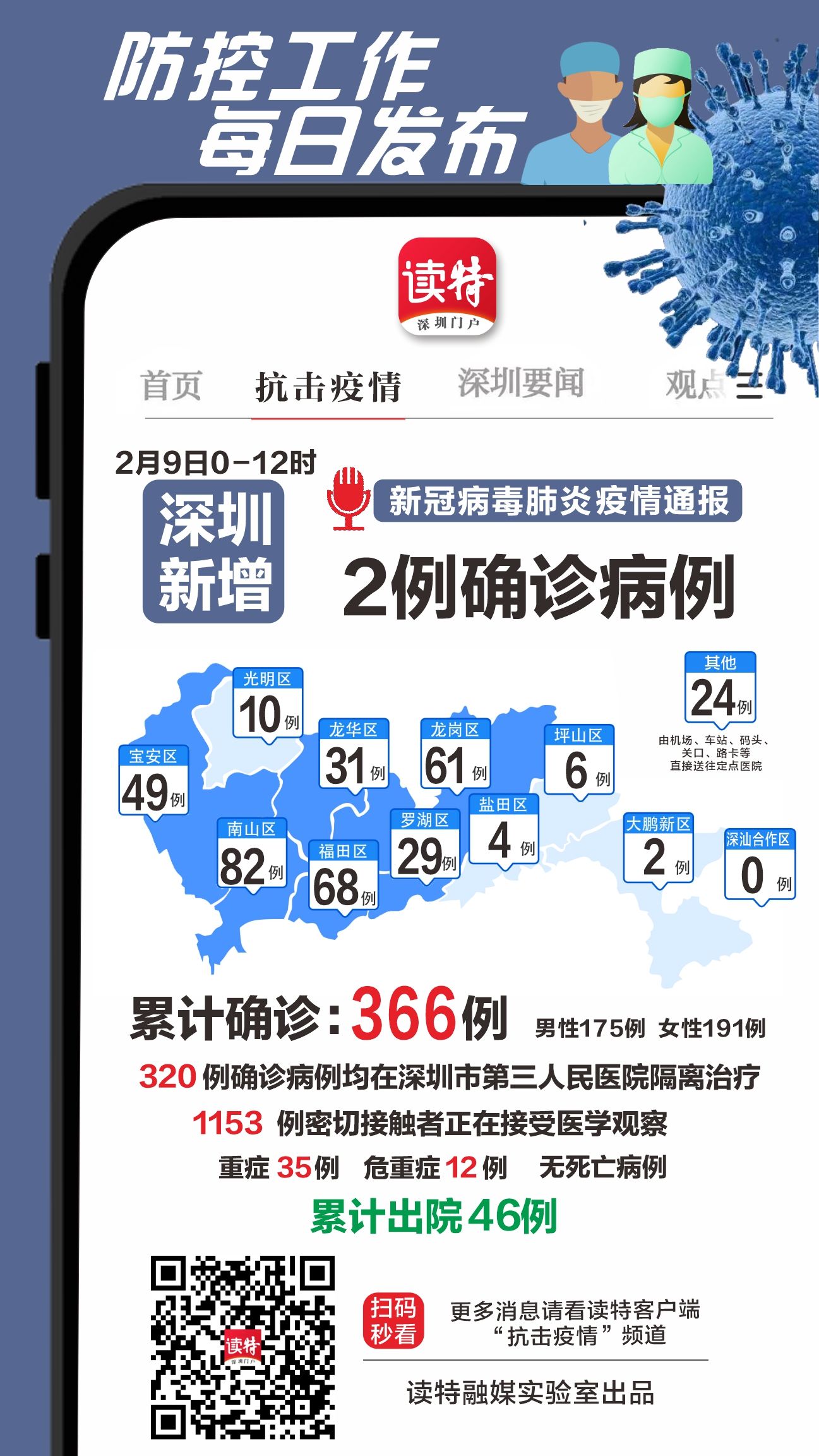 2020年2月9日0時至12時,深圳市報告新型冠狀病毒感染的肺炎新增確診病例2例,累計確診366例(個案詳情今晚公布)。
