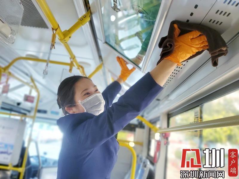 深圳巴士集團(tuán)四分公司工作人員對公交車進(jìn)行消毒擦洗。
