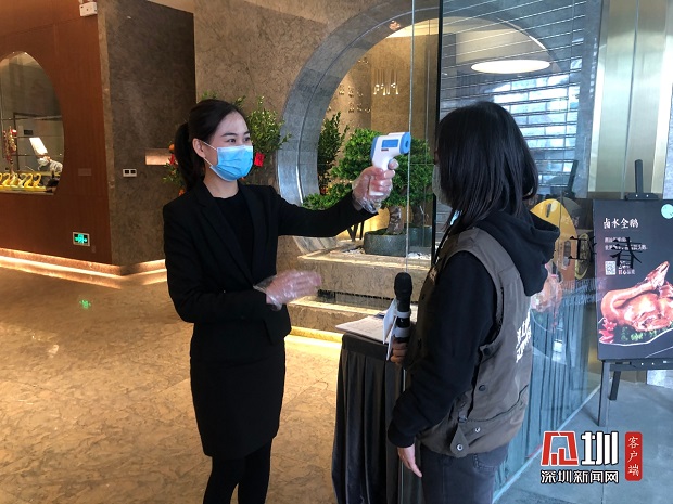 春江潮餐廳對(duì)進(jìn)店人員測量體溫。