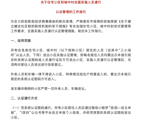 2月9日,深圳發(fā)布《關(guān)于住宅小區(qū)和城中村全面實施人員通行認(rèn)證管理的工作指引》,文中明確表示所有在各類住宅小區(qū)、城中村居住的人員需通過微信小程序“深i您”、“i深圳”公眾號等平臺自主申報個人信息,并依憑獲取健康碼進出小區(qū),無須再做登記。