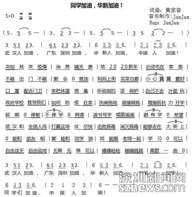 開學(xué)首日,深圳市福田區(qū)華新小學(xué)音樂教師黃家音作詞作曲《同學(xué)加油華新加油》祝福武漢,叮囑同學(xué),而這,作為華新小學(xué)綠色校本課程的一個(gè)縮影,福田區(qū)教科院在線教學(xué)巡查員徐奇志老師在觀看后很是感動(dòng),她評(píng)價(jià)道:一樣的疫情,不一樣的開學(xué)第一課。福田區(qū)教科院音樂教研員楊岳軍老師則認(rèn)為詞曲富有童趣,適合少兒,簡(jiǎn)單通俗,易于傳唱。