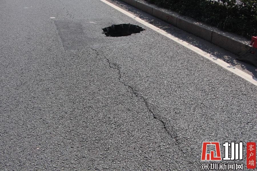 上午10點40分,記者在現(xiàn)場看到,該路面有一個直徑約一米、深約一米的坑口,旁邊還有一道長約20米的裂痕。工作人員正在使用雷達(dá)儀器對地面情況進(jìn)行勘測,同時該路段及靠深南大道一條車道已暫時被封鎖,福田區(qū)交警大隊也在現(xiàn)場指揮交通。據(jù)悉,該位置較臨近的地鐵2、3路線的站點,一位深圳地鐵的工作人員告訴記者,目前該事故沒有對其線路運行造成影響,也非先前修挖地鐵所致。