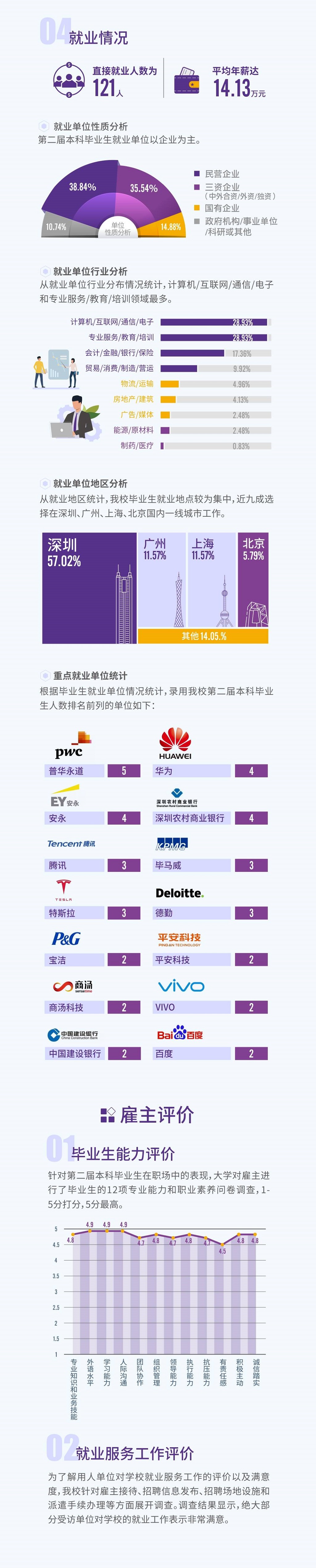 2019年,本科畢業(yè)生就業(yè)單位性質(zhì)更多元。除跨國公司、民營企業(yè)外,更多學(xué)生被國有企業(yè)、事業(yè)單位青睞。數(shù)據(jù)顯示,第二屆本科畢業(yè)生的就業(yè)單位中,民營企業(yè)占38.84%,如華為、百度;三資企業(yè)(中外合資/外資/獨資)占35.54%,如騰訊、寶潔、可口可樂、四大會計師事務(wù)所;國有企業(yè)占14.88%;另有10.74%畢業(yè)生受聘于政府機構(gòu)/事業(yè)單位/科研等機構(gòu)。