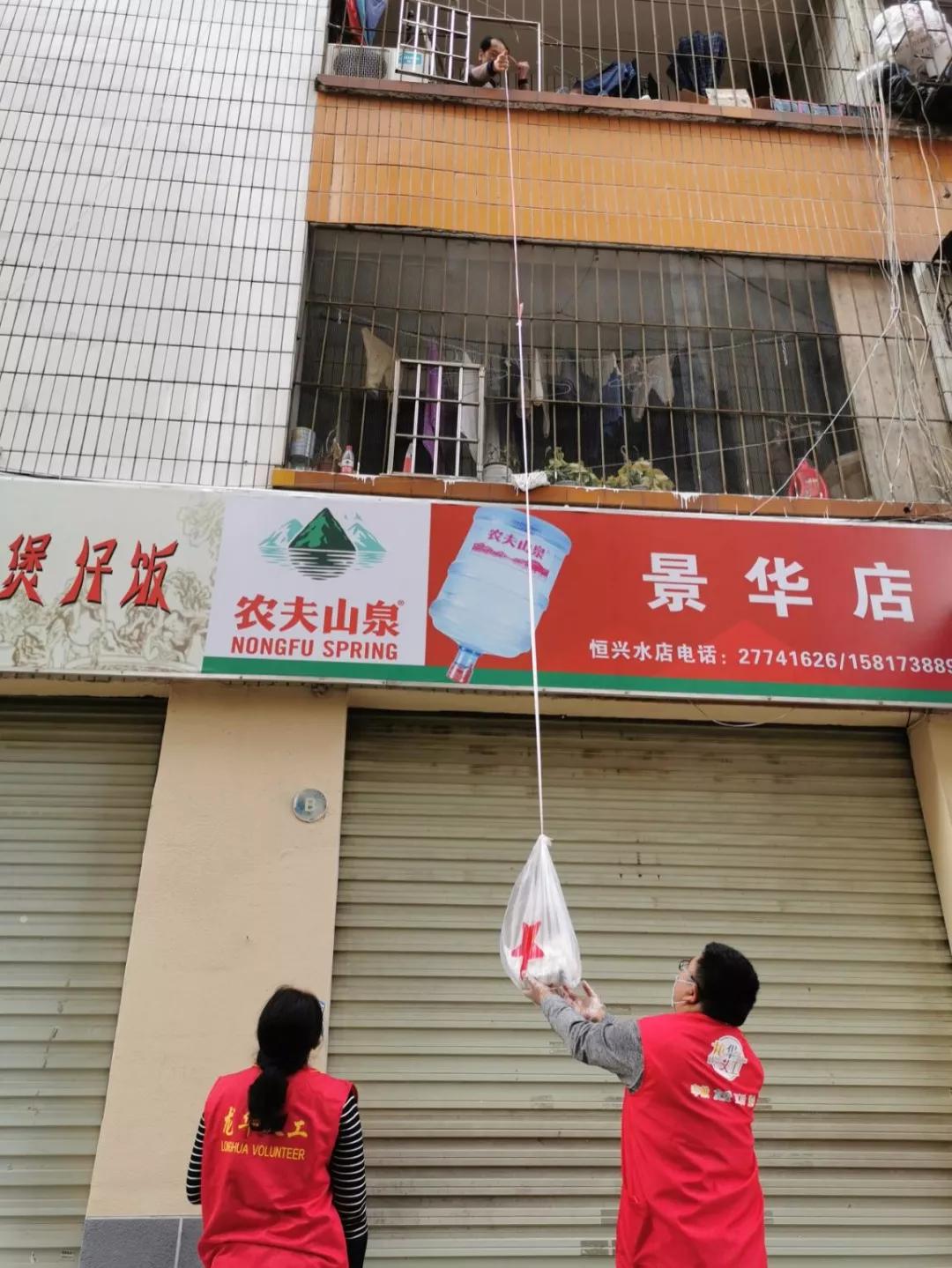 “為了實現(xiàn)無接觸配送,每天阿姨會把繩索放下來,她會電話告訴我們需要的菜品和生活用品,我們把她需要的東西都‘送’上去”。趙發(fā)威日常除了服務(wù)社區(qū)弱勢群體購買生活必需品,還承擔(dān)機動崗為需要替崗的志愿者“愛心接力”、執(zhí)行社區(qū)抗疫檢測點的測溫登記工作。