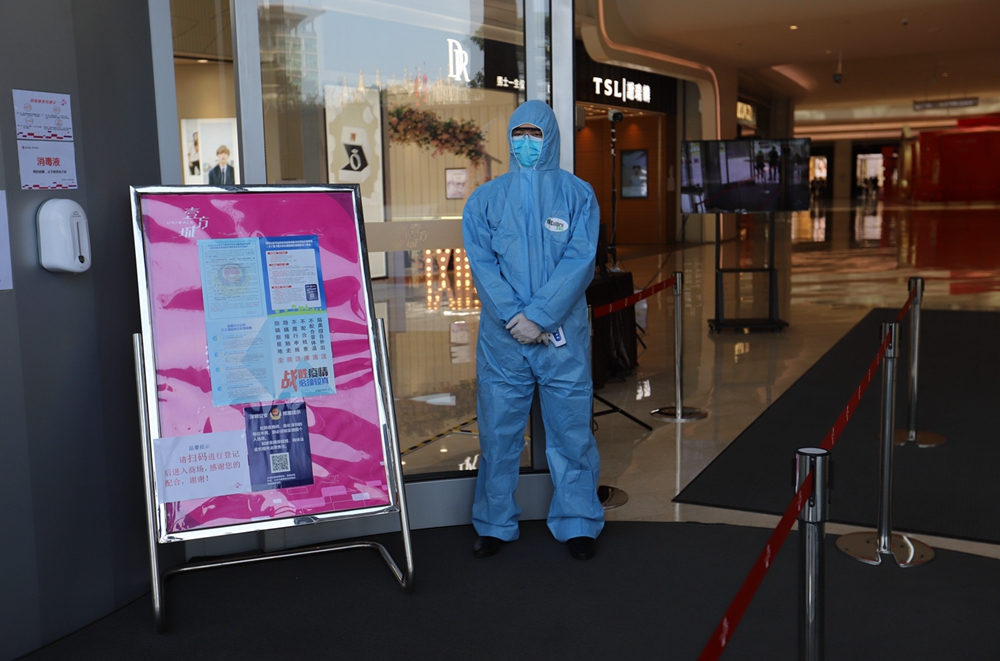 當(dāng)天上午11時,記者來到壹方城,過去熱鬧的正門廣場上如今僅有寥寥幾個行人。往大門走去,記者看到兩側(cè)的門已經(jīng)關(guān)閉,只留下中間的通道給市民進(jìn)出,進(jìn)口和出口分開,市民進(jìn)入商場時必須掃碼實名登記,身著防護(hù)服的工作人員在入口處引導(dǎo)市民登記和測溫。