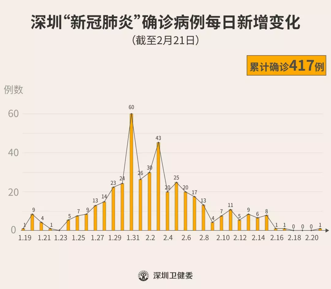 截至2月21日24時,深圳累計(jì)報告“新冠肺炎”確診病例417例。2月21日當(dāng)天全市新增確診病例1例(個案詳情今晚公布)。 ▲新增出院病例已超過新增確診病例 累計(jì)報告確診病例中,男性197例、女性220例。 按照病例管理地區(qū)劃分,南山區(qū)87例、福田區(qū)81例、龍崗區(qū)71例、寶安區(qū)62例、龍華區(qū)34例、羅湖區(qū)32例、光明區(qū)11例、坪山區(qū)7例、鹽田區(qū)6例、大鵬新區(qū)2例、其他(指由機(jī)場、車站、碼頭、關(guān)口、路卡等直接送往定點(diǎn)醫(yī)院的)24例。 目前,重癥10例、危重癥9例,死亡2例,累計(jì)出院222例。 193例確診病例均在深圳市第三人民醫(yī)院隔離治療。 202例密切接觸者正在接受醫(yī)學(xué)觀察。 資料來源:深圳市疾控中心、深圳市衛(wèi)健委、廣東省衛(wèi)健委