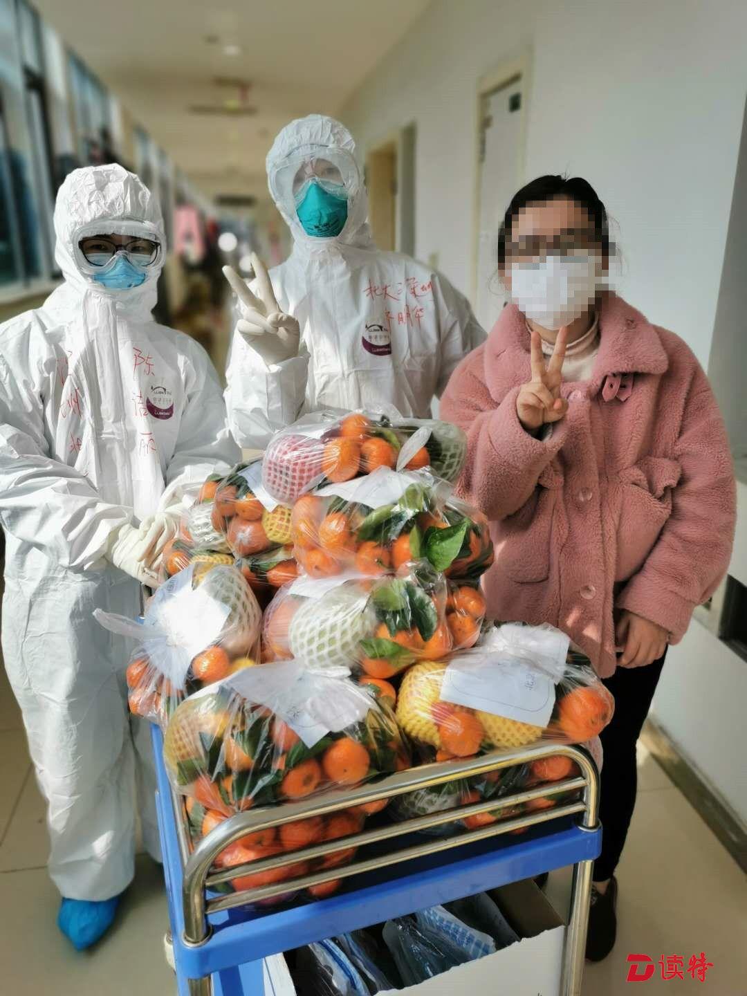 深圳醫(yī)療隊(duì)員為患者發(fā)放沙糖桔與蘋果。水果也是從廣東遠(yuǎn)道而來(lái),是廣東愛心人士捐給深圳醫(yī)療隊(duì)的,隊(duì)員們分享給患者朋友。