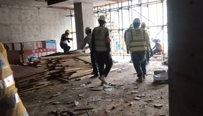 尚龍?jiān)肥┕がF(xiàn)場(chǎng),工人們戴著口罩在進(jìn)行模板拆除作業(yè)。