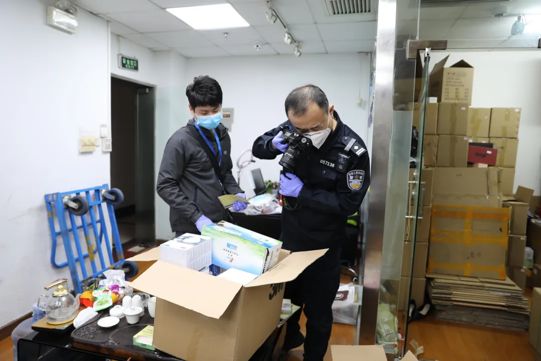 (刑警大隊民警對查獲的偽劣口罩拍照取證)