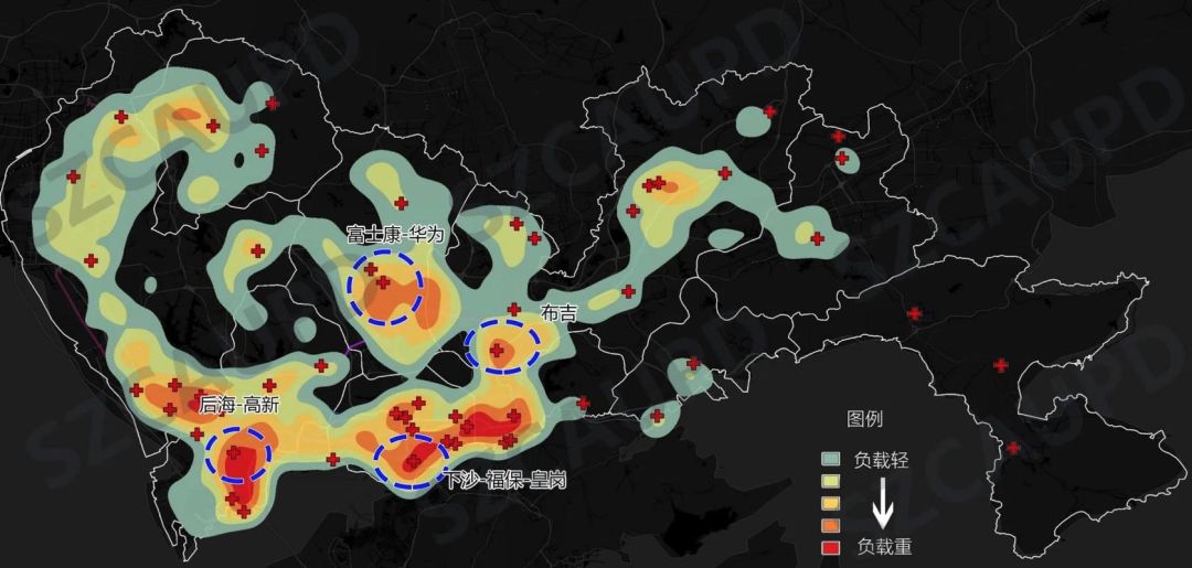 通過疊加疫情風(fēng)險、門診負(fù)荷與服務(wù)半徑,發(fā)現(xiàn)部分區(qū)域的應(yīng)急醫(yī)療服務(wù)最具超載風(fēng)險。這些地區(qū)包括富士康-華為片區(qū)、下沙-福保-皇崗片區(qū)、后海-高新園片區(qū)、布吉片區(qū)等,也就是說,這些地區(qū)的疫情發(fā)生風(fēng)險較高、人群密度與規(guī)模較大、而醫(yī)療設(shè)施相對有限,假若疫情爆發(fā),則其對應(yīng)的發(fā)熱門診將承載較大壓力。