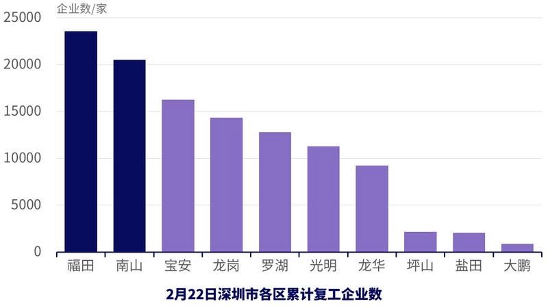 截至2月22日,全市累計復(fù)工企業(yè)已達(dá)11萬余家,其中,福田區(qū)、南山區(qū)已有超過2萬家企業(yè)復(fù)工,復(fù)工率在全國主要經(jīng)濟(jì)城市中名列前茅。