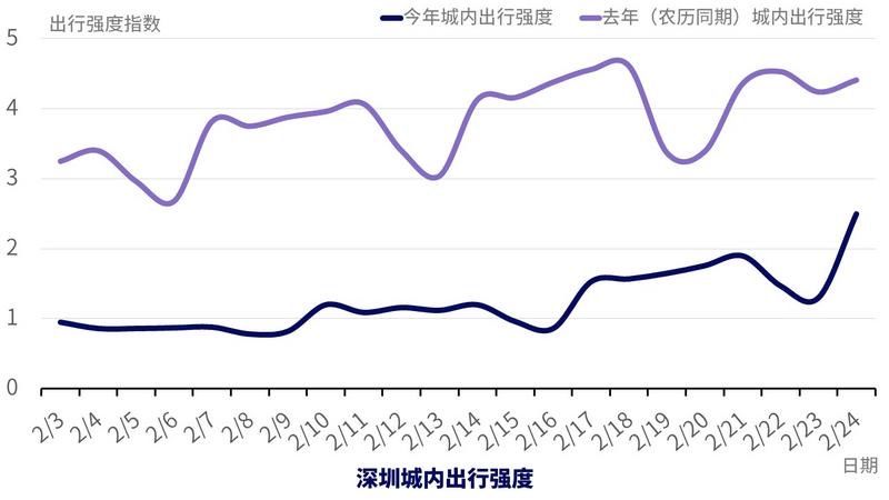 人員的遷入,復(fù)工的進(jìn)行時,讓深圳久違的早高峰再次出現(xiàn),2月24日,深圳早高峰時段出行車輛42.09萬輛,較上一周上升58%,城內(nèi)出行強(qiáng)度達(dá)去年農(nóng)歷同期的56.7%。