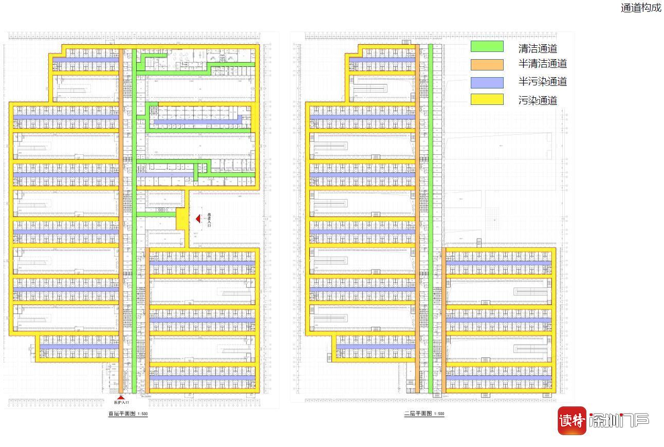據(jù)了解,應(yīng)急醫(yī)院采用更加嚴(yán)格的“四區(qū)三通道”布局,分為清潔區(qū)、半清潔區(qū)、半污染區(qū)、污染區(qū)、清潔通道、半清潔通道、污染通道。