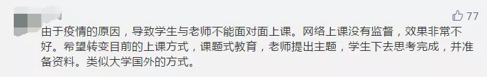 在疫情期間,如何做好“停課不停學(xué)”,許多參與者也給出自己的建議。有家長建議將目前的上課形式轉(zhuǎn)變?yōu)椤罢n題式教育”,即由老師出主題,學(xué)生獨(dú)立思考完成。