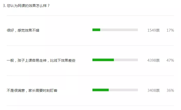網(wǎng)課的效果到底如何?根據(jù)深圳新聞網(wǎng)的調(diào)查,64%的參與者對網(wǎng)課效果感到“滿意”或“一般”。多數(shù)參與者認(rèn)為“孩子容易走神”或“需要家長時(shí)刻監(jiān)管”。在低年級孩子“難以集中注意力”這一問題在留言里尤為突顯。