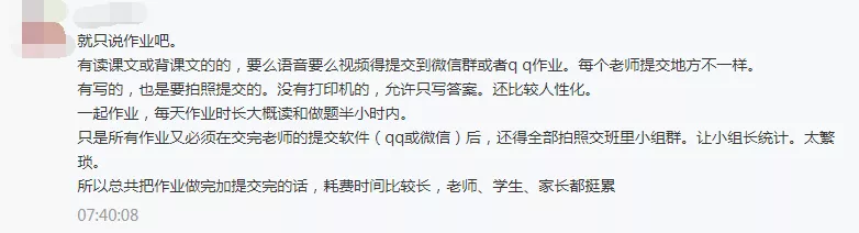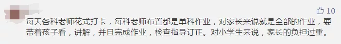 22%的參與者認(rèn)為,應(yīng)該更加合理地安排作業(yè)。有家長(zhǎng)提到,交作業(yè)太過麻煩:從做作業(yè)到交作業(yè)的整個(gè)流程比上課時(shí)間還長(zhǎng);也有家長(zhǎng)提及,每天下班后盯著孩子做作業(yè)“心很累”。