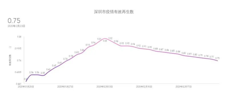 最后,考慮新冠肺炎的有效再生數(shù)。有效再生數(shù),即有效感染數(shù),指一個(gè)患病者平均可以感染健康者的人數(shù)。當(dāng)有效再生數(shù)下降到1以內(nèi)時(shí),可以認(rèn)為疫情就已經(jīng)得到了很好的控制并將逐漸消失。以全國(guó)第一例確診患者的報(bào)道時(shí)間為疫情開始時(shí)間,計(jì)算出深圳市疫情有效再生數(shù),可以看到有效再生數(shù)在經(jīng)過(guò)一段時(shí)間上升后,在2月3日附近出現(xiàn)拐點(diǎn),2月3日之后處于逐漸下降水平,2月23日已從峰值的1.05下降到了0.75,說(shuō)明針對(duì)疫情的一系列防控措施取得了很好的效果。